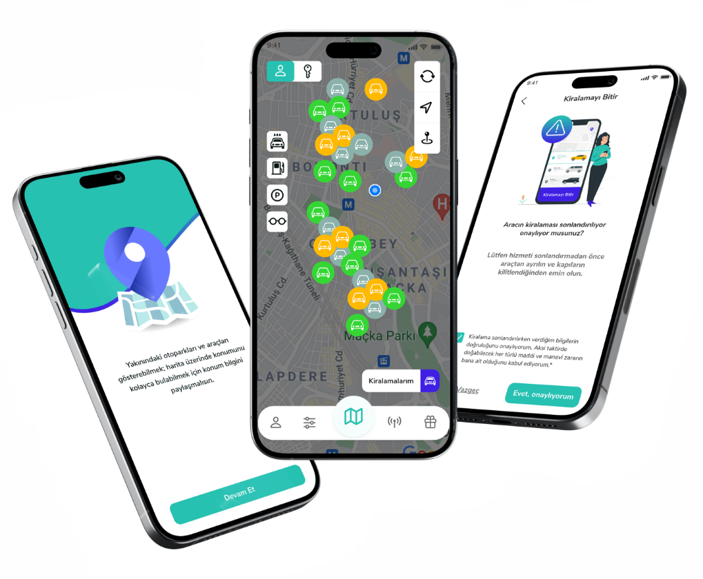 The project includes user-to-user and organization-to-user car rental services. The aim is to monitor the use of the vehicle and all data related to the vehicle through the user’s key-independent application, thanks to telemetry devices. The platform allows all users to rent out their vehicles through the mobile application and generate income. The user can also find the closest and most suitable vehicle with map integrations, rent the vehicle from any location with online payment and drop it off at any location with an instant reservation method.